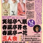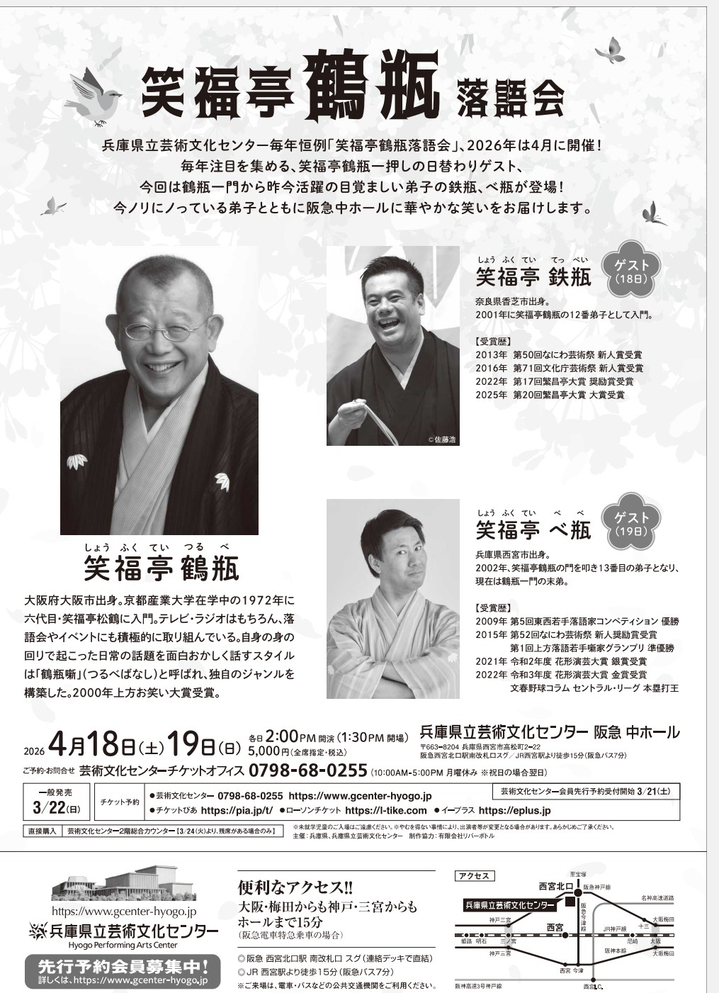 中部 6月28日(日) 6月28日(日) 昭和57年会in静岡・新居町 【開演】 14時30分〜 【会場】 新居宿寺道 本果寺本堂(湖西市新居町新居1362-1) 【料金】 前売3500円/当日4000円 【出演】 笑福亭べ瓶、三遊亭志う歌、三遊亭好の助、立川小春志、春風亭昇也 【問合わせ】 電話予約:090-9939-6558 (寺道DE落語会) ※15〜20時対応可能 午前中はNG メール予約:yatou810@gmail.com 東京 6月27日(土) 6月27日(土) 笑福亭べ瓶・春風亭昇也二人会 【開演】 14時20分~ 【会場】 亀戸梅屋敷 【料金】 3000円 【出演】 笑福亭べ瓶、春風亭昇也 【問合わせ】 メール予約:daifukusan1031@gmail.com 東京 6月14日(日) 6月14日(日) 笑福亭べ瓶・田辺銀冶ふたり会 【開演】 14時~ 【会場】 スタジオフォー 【料金】 前売2500円/当日中3000円 【出演】 笑福亭べ瓶、田辺銀冶 【問合わせ】 メール予約:bunrakuningyo@gmail.com 電話予約:090-8086-9125(ハナヤ) 北海道 5月24日(日) 5月24日(日) 江戸の志う歌×上方のべ瓶 東西落語会 【開演】 15時〜 【会場】 渡辺淳一文学館 ホール 【料金】 前売3500円/当日3700円 【出演】 笑福亭べ瓶、三遊亭志う歌 【問合わせ】 電話予約:090-7258-5488(主催者) メール予約:utataroudesu@yahoo.co.jp ご予約・詳細はこちら 北海道 5月23日(土) 5月23日(土) べ瓶・志う歌二人会 in帯広 【開演】 14時〜、17時〜 【会場】 Sugar 【料金】 3500円(ワンドリンク付) 2日間通し券6000円 【出演】 笑福亭べ瓶、三遊亭志う歌 【問合わせ】 Sugar:090-3117-4394(佐藤) 東京 5月22日(金) 5月22日(金) 露の新治〈知命の〉独演会 【開演】 18時30分〜 【会場】 下谷神社会館 【料金】 前売3000円/当日3500円 【出演】 露の新治 ゲスト:笑福亭べ瓶 【問合わせ】 電話予約:070-9358-6130(留守電対応) メール予約:tokyotsuyushin@gmail.com 東京 5月17日(日) 5月17日(日) 青梅 笑福亭べ瓶独演会 【開演】 12時~、15時~ 【会場】 青梅本町会館 【料金】 前売1000円/当日1500円/通し券1500円 【出演】 笑福亭べ瓶 【問合わせ】 メール予約:amenomeimei2923@gmail.com ※お名前、人数をお書きください。 東京 5月11日(月) 5月11日(月) べ瓶・幸乃ふたり会in新橋 落語とトークと浪曲と 【開演】 19時〜 【会場】 espace天 【料金】 3000円(ワンドリンク付) 【出演】 笑福亭べ瓶、京山幸乃(曲師:広沢美舟) 【問合わせ】 電話:03-4288-8469(受付:10:00~17:00) メール予約:order@espace-ama.jp 関東 5月4日(月) 5月4日(月) 笑福亭べ瓶・春風亭昇也・春風亭一花三人会 宮信明セレクション落語会2026 【開演】 14時〜 【会場】 新井ふれあい会館 ふれあいホール 【料金】 一般2000円/高校生以下500円 【出演】 笑福亭べ瓶、春風亭昇也、春風亭一花 【問合わせ】 妙高文化振興事業団・妙高市文化ホール:0255-72-9411 関西 4月19日(日) 4月19日(日) 笑福亭鶴瓶落語会 【開演】 14時〜 【会場】 兵庫県立芸術文化センター 中ホール 【料金】 全席指定5000円 【出演】 笑福亭鶴瓶 ゲスト:笑福亭べ瓶 【問合わせ】 芸術文化センターチケットオフィス:0798-68-0255(10〜17時) ご予約・詳細はこちら →