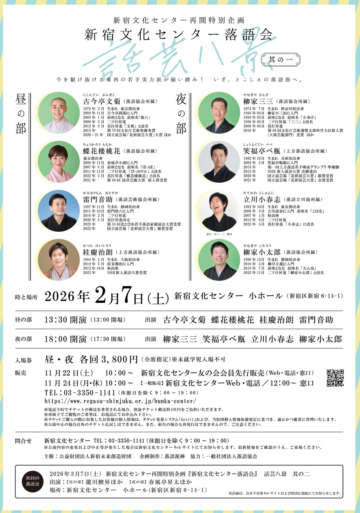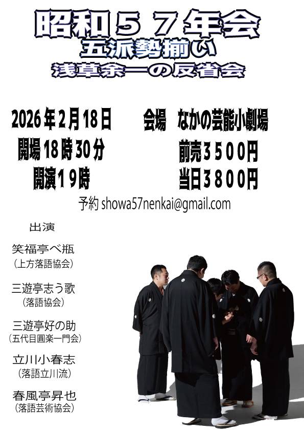 東京 2026年 6月14日(日) 6月14日(日) 笑福亭べ瓶・田辺銀冶ふたり会 【開演】 14時~ 【会場】 スタジオフォー 【料金】 前売2500円/当日中3000円 【出演】 笑福亭べ瓶、田辺銀冶 【問合わせ】 メール予約:bunrakuningyo@gmail.com 電話予約:090-8086-9125(ハナヤ) 東京 2026年 4月10日(金) 4月10日(金) 巧みな夜会 10回記念スペシャル 【開演】 19時~ 【会場】 espace 天 【料金】 前売2500円/当日3000円 【出演】 笑福亭べ瓶、国本はる乃、広沢菊春 曲師:広沢美舟 【問合わせ】 電話予約:03-4288-8469(10~17時) メール予約:order@espace-ama.jp 東京 2026年 4月1日(水) 4月1日(水) 小痴楽・べ瓶・昇也三人会~ワイワイガヤガヤ~ 【開演】 18時50分〜 【会場】 日本橋社会教育会館 【料金】 3500円 【出演】 笑福亭べ瓶、柳亭小痴楽、春風亭昇也 【問合わせ】 独演会.com:090-8014-7515(留守電) メール予約:daifukusan1031@gmail.com 東京 2026年 3月15日(日) 3月15日(日) 笑福亭べ瓶独演会 BE MY bebe 【開演】 18時20分〜 【会場】 亀戸梅屋敷 【料金】 3000円 【出演】 笑福亭べ瓶 【問合わせ】 独演会.com:090-8014-7515 メール予約:daifukusan1031@gmail.com 東京 2026年 2月22日(日) 2月22日(日) 笑福亭べ瓶・春風亭昇也二人会 【開演】 14時20分~ 【会場】 亀戸梅屋敷 【料金】 3000円 【出演】 笑福亭べ瓶、春風亭昇也 【問合わせ】 メール予約:daifukusan1031@gmail.com 関西 2026年 2月21日(土) 2月21日(土) 笑福亭べ瓶独演会 べべコレ2025in西宮 【開演】 14時~ 【会場】 西宮市山口ホール 【料金】 前売2000円/当日2500円/65歳以上1500円/学生1000円 【出演】 笑福亭べ瓶 ゲスト:林家あずみ 【問合わせ】 西宮市山口ホール:078-904-2760(月曜休館) メール予約:info@yamaguchi-hall.com 東京 2026年 2月18日(水) 2月18日(水) 昭和57年会~五派勢揃い~ 浅草余一の反省会 【開演】 19時〜 【会場】 なかの芸能小劇場 【料金】 前売3500円/当日3800円 【出演】 笑福亭べ瓶、三遊亭志う歌、三遊亭好の助、立川小春志、春風亭昇也 【問合わせ】 メール予約:showa57nenkai@gmail.com ご予約・詳細はこちら 東京 2026年 2月14日(土) 2月14日(土) 春蝶・べ瓶二人会 梶原いろは亭スペシャル ゆかいな二人の会 【開演】 13時~ 【会場】 梶原いろは亭 【料金】 前売2000円/当日2500円 【出演】 桂春蝶、笑福亭べ瓶 【問合わせ】 梶原いろは亭:03-6322-1622 東京 2026年 2月7日(土) 2月7日(土) 話芸八景 其の一 【開演】 18時〜 【会場】 新宿文化センター 小ホール 【料金】 3800円 【出演】 柳家三三、笑福亭ベ瓶、立川小春志、柳家小太郎 【問合わせ】 新宿文化センター:03-3350-1141 ご予約・詳細はこちら 中四国 2026年 2月1日(日) 2月1日(日) 玉藻寄席 第25回記念公演 柳家花緑・桂春蝶東西二人会 【開演】 14時〜 【会場】 レクザムホール 小ホール 【料金】 全席指定4300円 【出演】 柳家花緑、桂春蝶、笑福亭べ瓶、蝶花楼桃花 ご予約・詳細はこちら →