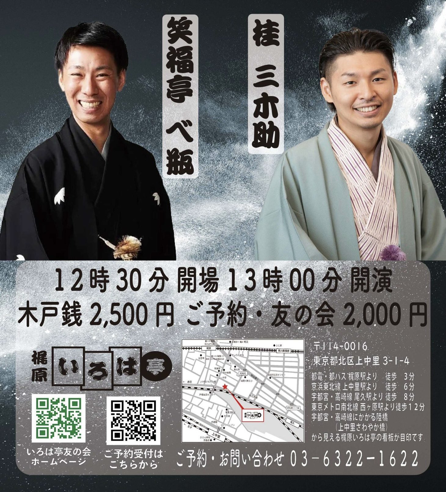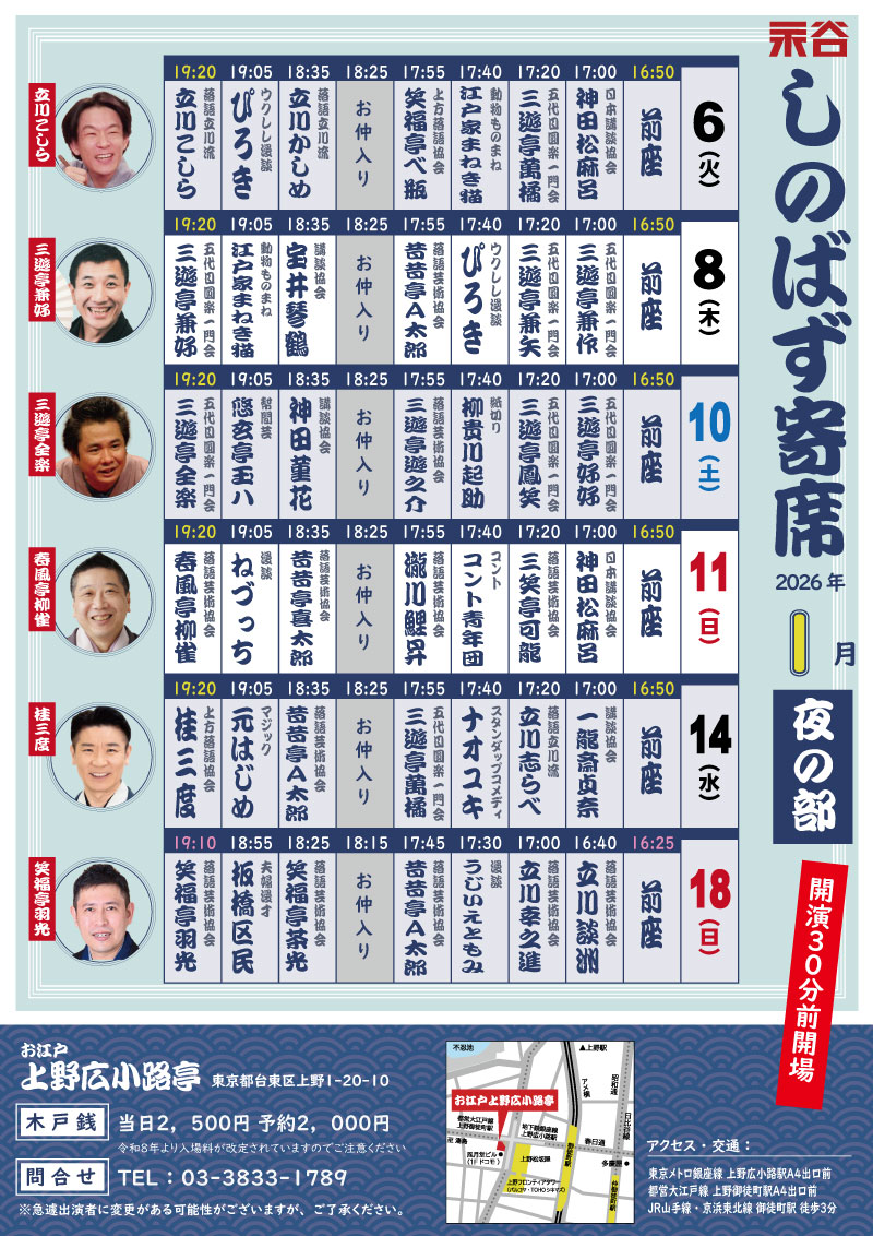 三遊亭兼作、三遊亭楽天、笑福亭べ瓶、三遊亭楽之介、三遊亭楽麻呂〈お仲入り〉三遊亭百生、伊藤夢葉、三遊亭圓橘